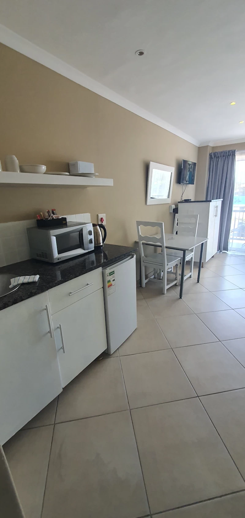 • In-Room Amenities: A small kitchenette equipped with a bar fridge, microwave, kettle, crockery, and cutlery. Complimentary coffee and tea are provided.
